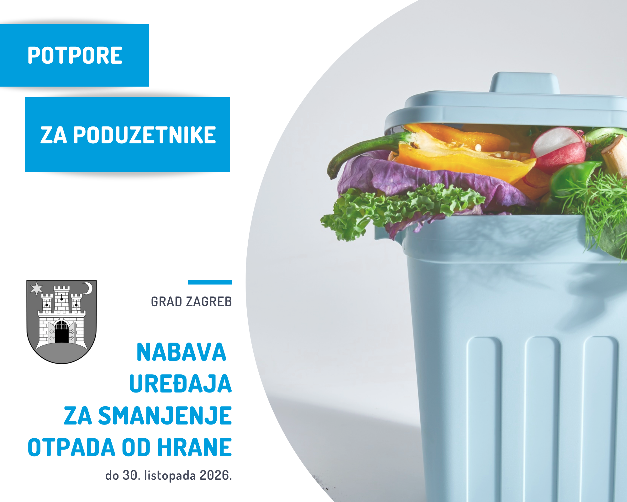 Grad Zagreb objavljuje Javni poziv za dodjelu potpora za nabavu uređaja za smanjenje otpada od hrane. Maksimalni intenzitet potpore je 70 % prihvatljivih troškova, ali ne više od 20.000,00 eura po Zahtjevu. Rok za podnošenje prijave započinje 1. prosinca 2025., a prijave se podnose do 30. listopada 2026. do 16:00 sati.