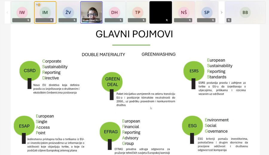 Osim ovih pojmova, na edukaciji su se polaznici upoznali sa strateškim smjernicama EU i RH o zelenoj tranziciji poslovanja, s održivosti poslovanja, održivim investicijama te izvorima financiranja održivih ulaganja.